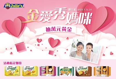 有多久沒跟媽咪拍張照? 有多久沒跟媽咪說聲我愛你?溫情的五月裡.Julie’s餅乾特別推出了「金愛秀媽咪」抽獎活動,有機會獲萬元的黃金條塊”秀秀”親愛的媽咪喲!趁母親節和媽咪表達最深的愛意,又有機會獲萬元黃金,現在就快到各大賣場(全聯除外),購買附有活動貼紙的外包裝Julie’s餅乾,並與最愛的母親合照,寄回個人資料和合照,價值萬元黃金可能就是您的喔!