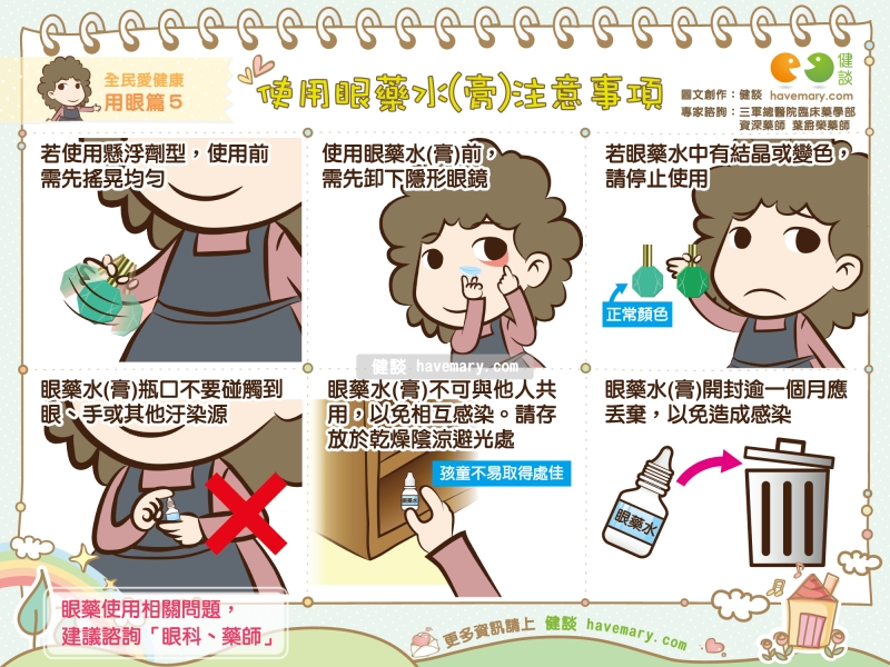 使用眼藥水(膏)時,應留意瓶口不要碰觸到眼、手或其他汙染源,以免污染藥劑。