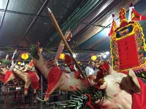 白天還空盪盪的供桌此刻已經擺滿了罐頭、饅頭、米粉等供品,還並排著豬跟羊等祭品。豬的嘴巴含著鳳梨、上頭插著香,背上則擺著一隻雞,架臺下還吊掛著嘴巴一開一闔的鯉魚。我第一次看到這樣的場面,看得目不轉睛,雖然不清楚其中的涵義,但對我來說這就像奇特的藝術裝置般讓我大開眼界。