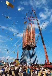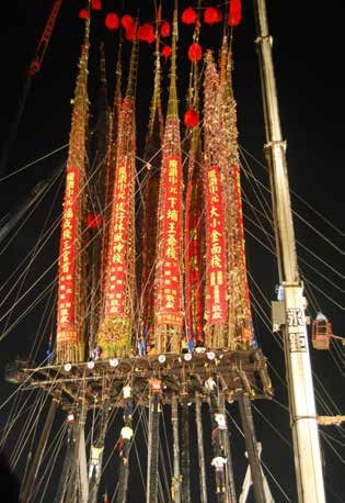 眼前的孤棚結構總高度超過四十公尺,如果以公寓樓層來計算,就是超過十層樓的大樓。況且孤棧不是金屬鑄製而是竹子編成的,由於會隨風晃動,因此捆綁作業要非常謹慎確實,參加者也在一旁默默注視。