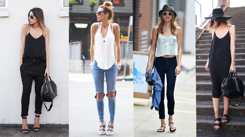 細肩帶的背心非常適合想要顯露性感的小胸女生,露出鎖骨或是腰部,顯露性感的曲線,如果擔心太暴露,也可以內搭T恤,展現不同的風格。