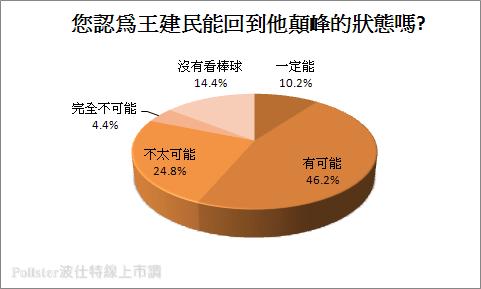 王建民在大聯盟重新復出,連兩場好投再度掀起熱潮,一般民眾認為他能回到他顛峰的狀態嗎?調查結果顯示,有10.2%的民眾表示「一定能」,46.2%則認為「有可能」,24.8%則仕表示「不太可能」,僅有4.4%認為「完全不可能」,14.4%「沒有看棒球」。由此可知,有高達56.4%的民眾都認為王建民能夠回到巔峰狀態﹝一定能+有可能﹞,因為就算王建民後來被下放到藍鳥的3A,但是先發兩場都表現的相當好,總教練也非常滿意,因此王建民並沒有失去水準,民眾還是都對他相當有信心。
