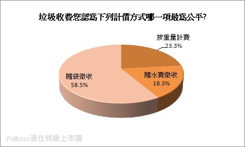 垃圾收費如何計價最公平呢?市調結果顯示,按重量計費占23.3%、按水費徵收占18.3%、隨袋徵收占58.5%。環保署傳出擬推新的垃圾計價方式,改由秤重計價,普遍民眾認為不公平並且難以接受,民眾擔心未來倒垃圾還得大排長龍,加上秤重計費的費率恐高過現行隨袋徵收的專用垃圾袋費,因此反彈聲四起,不過對於小家庭常常有裝不滿的困擾,秤重計費相對來得公平。現行隨袋徵收已普遍受大眾認同,在垃圾減量發揮一定效果,不過專用垃圾袋仍有進焚化爐汙染等問題。而過去或現在仍有縣市實行的隨水費徵收,是否符合公平原則?用水量和垃圾量無關,隨著用水量徵收垃圾費用似乎有失合理。