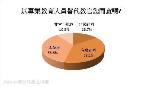 調查結果顯示共有53.9%的民眾表示認同;其中依照程度又可以細分為15.7%的民眾表示「非常認同」、38.2%的民眾表示「有點認同」,相反地表示不認同則相對拿下46.1%的數據;35.6%的民眾表示「不大認同」、10.5%的民眾則是「非常不認同」,可以了解雖然超過半數的民眾認同教官應全數退出校園,由專業教育人員替代,不過和持相反意見的民眾相比,比例差距不大,可以了解此一政策對於民眾而言仍有待商榷,約五成四的民眾表示支持、四成六左右的民眾則是不支持此作法。