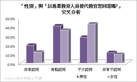 從性別進行分析可以看出相對來說,男性較女性認同教官退出校園,以專業教育人員替代教官的看法,因此在「非常認同」及「有點認同」的意見上所占比例皆略高於女性,可以假設女性相對來說或許較無法保護自己,因此相對會較倚賴教官,依此增加對於校園安全感的認可,比起男性就顯得較沒有這麼認同教官應該離開校園此一政策。
