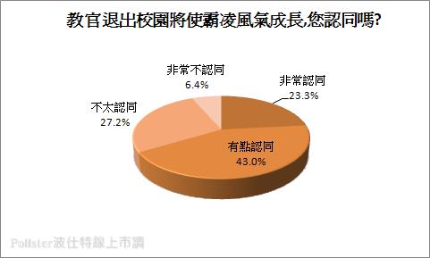 教官進駐校園長久以來頗受爭議,日前三讀通過的高級中等教育法明訂在八年之內,教官必須全面退出高中職校園,回歸國防體系。不過教官在校園內除了擔任教育全民國防責任外,維護校園安全及生活輔導也是教官們的重要工作,因而教官撤離校園,民眾如何看待?Pollster波仕特線上市調﹝http://www.pollster.com.tw﹞在7/1就特別針對此問題進行市場調查。
