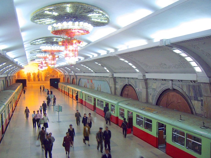 北韓的地鐵是金日成下令興建的,1969至1972年間,第一批車站啟用。根據一九九四年發行的英文旅遊指南,這個系統被描述成「不只具有交通意義,也是意識型態的教育場所」,壁畫、彩繪甚至站名,都能讓你深深體會這點。相反的, 旅遊指南卻解釋:「內部裝飾極具藝術性,將光榮的革命史,與偉大領導人金日成的豐功偉業,傳達給後代子孫。」