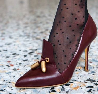 這是個人喜好的問題。我們遇到不少各種年齡層的愛好者與堅決反對的人。要知道,高跟鞋+短襪的搭配一直充滿爭議,這也是為何這樣的組合不討人喜歡。這種搭配不歡迎長度到小腿肚的透明絲襪,而是擁抱真正的小短襪。你擔心看起來像小丑波左(Bozo le Clown)嗎?選擇與高跟鞋或衣服同色系的小短襪就對了。範例:酒紅色高跟鞋+酒紅色襪子+灰色長褲;紅色高跟鞋+深藍色襪子+深藍色洋裝。你當然也可以穿上點點、金蔥或蕾絲的短襪,為高跟鞋增添趣味。