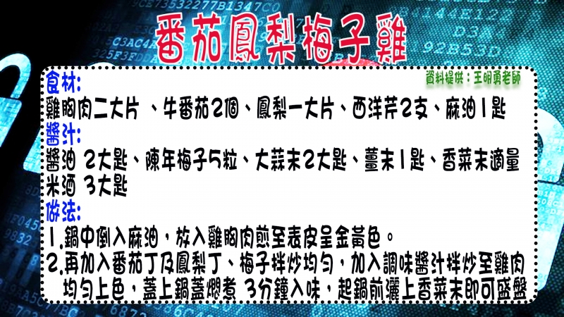 雞胸肉二大片 、牛番茄2個、鳳梨一大片、西洋芹2支、麻油1匙