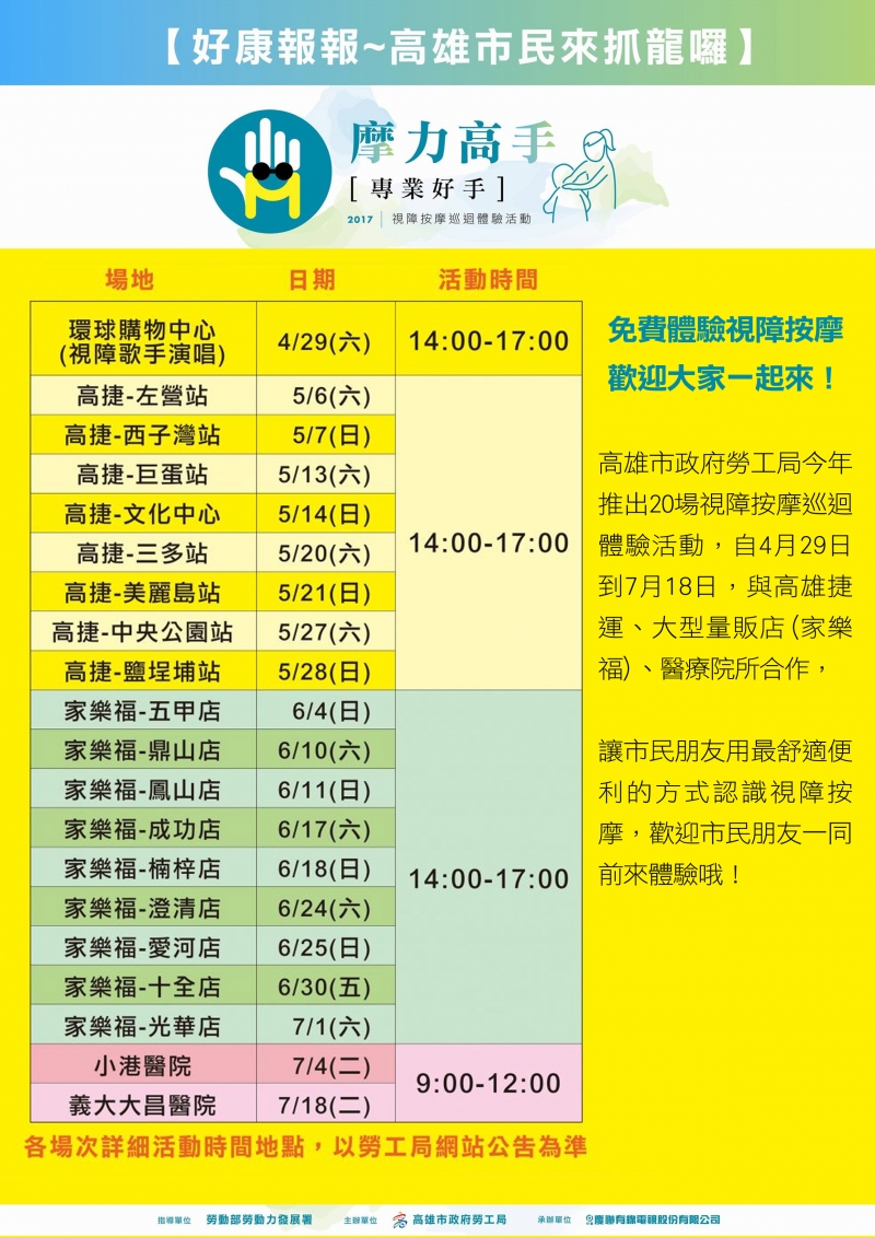 [高雄][免費體驗] 摩力高手 - 視障按摩巡迴體驗活動 106/4/29 - 106/7/18 週六、日巡迴舉辦哦!
