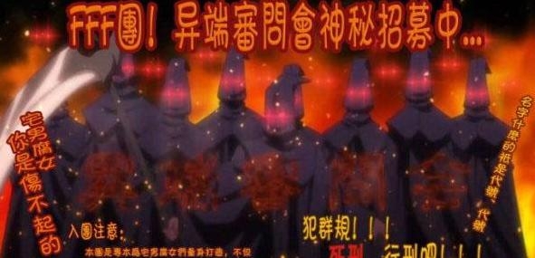 這最早是輕小說《笨蛋、測驗、召喚獸》及其衍生作品中登場的一個學生社團,成員全部都是單身狗,出於偉大(嫉妒)的理由去審判擁有很多妹子的人生贏家,口號是「燒死異性戀」,團服為全身黑袍,戴著寫有「F」字樣的面罩,且手持巨型的死神鐮刀。