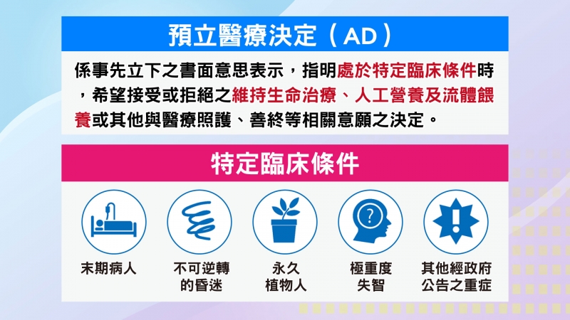 彰基安寧緩和療護科主任蔡佩渝表示,過去根據《安寧緩和醫療條例》,我們只有讓已經「罹患嚴重傷病,經醫師診斷認為不可治癒,且有醫學上的證據,近期內病程進行至死亡已不可避免者」的所謂「末期病人」,有不施行心肺復甦術或維生醫療的權利。但是已經三讀通過的《病人自主權利法》,把適用的範圍擴大了。包括以下五種情況「末期病人、不可逆轉之昏迷、永久植物人、極重度失智、其他經政府公告之重症」的病人,都可以選擇接受或拒絕「維持生命治療」及「人工營養與流體餵養」。(但上述五種狀況的定義還要請衛福部訂出判定標準,再由醫師臨床判斷。)