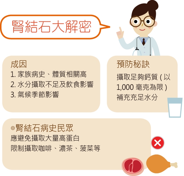 但是曾有腎結石病史的民眾,則應該避免大量攝取高蛋白質食物,因為大魚大肉的飲食反而會增加尿液中鈣質、草酸的代謝,就容易於尿道形成結石;此外,務必限制富含草酸食物的攝取,像是咖啡、濃茶、菠菜、柑橘類、竹筍、葡萄、可可等食物,尿液中草酸的濃度相對較高,也會增加腎結石的風險;此外,無論是草酸鈣結石或是尿酸結石,皆需要攝取足夠的水分(至少2,000毫升),才足以將尿液稀釋預防結石的產生。除此之外,也應該避免時常攝取超過500毫克高劑量的維生素C的保健食品,因為高劑量的維生素C會增加尿液中草酸的濃度,反而會提高腎結石發生的機率,因此,儘量透過攝取天然食物來獲得足夠的維生素C,以芭樂為例,一顆中型的芭樂半顆就可以達到維生素C的每日建議攝取量100毫克,而其他水果像是奇異果、柑橘類、草莓等皆含有豐富的維生素C。