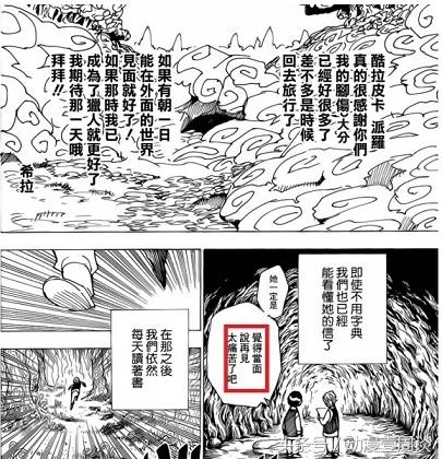 而這個希拉,在教會酷拉皮卡語言之後,就不辭而別,後面完全沒有她的消息,並且他們的關係沒有明顯的情感描述,更多的是互利關係。注意上面的文字,她其實可以早就離開這裡,但是每次接近痊癒的時候,又故意做成傷害,看來她的目的不單純,根據之前卡拉皮卡父親口中信息得知,他們族人有非常頻繁的轉移根據地,發現族人並不容易,或許希拉有可能是為了套取他們族人的情報。