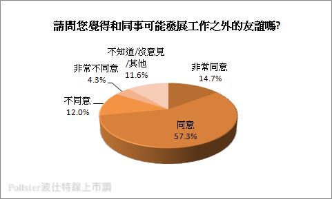 調查結果顯示,約七成的民眾表示同意,依照程度又可以區分為14.7%的民眾表示「非常同意」,57.3%的民眾表示「同意」,對於多數人來說,每天工作時間大約長達八小時以上,扣除睡覺時間,其實與同事相處的時間算是相當長,而在長久的相處下,多數人相信和同事間是有可能發展工作以外的友誼。反之,持相反意見認為同事不可能發展工作之外的友誼則占不到兩成的比例,其中12.0%的民眾表示「不同意」、4.3%民眾表示「非常不同意」,尤其若原本的話題大多只是圍繞在工作上,當一方離開原本的工作,後來有著不同的生活圈,要繼續維持聯繫則相對顯得較難,因此有一成六左右的民眾持同事間不可能發展工作之外友誼的看法。