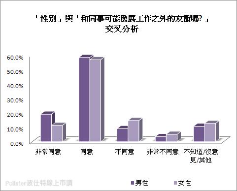 不管男性還是女性,對於同事是否可能發展工作之外的友誼,大多數都表示同意的看法,不過若是從相對值進行分析則可以看出男性其實又相對女性較同意同事是可能發展工作之外的友誼;在表示「非常同意」及「同意」的意見上所占比例都略高於女性,相對地女性持「不同意」及「非常不同意」的見解上則略高於男性所占的數據,可以了解男、女在面對同事間是否有友誼的看法上相對有著微微的差異性。
