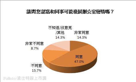 調查結果顯示,約六成的民眾表示同意;14.3%的受訪者表示「非常同意」、47.0%民眾表示「同意」,反之持相反意見者則是占兩成五左右的數據,15.7%的民眾表示「不同意」、8.7%民眾則是持「非常不同意」的看法。可以看出較認可同事間能夠發展友誼的比例相對高於同意同事間可能發展成戀情,推究其因可以假設或許工作上的戀情若沒有圓滿結局,分手後往往會導致一方離職,有了這層顧慮則認同辦公室戀情者相對較低於認同同事間有友誼存在者。