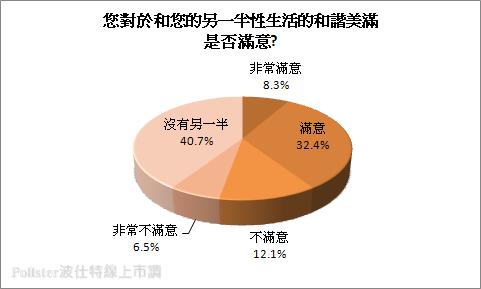 在愛情裡性生活不可或缺,拿出來討論多少令人感到害臊,透過市調進行調查。結果顯示,有4成表示性生活美滿,其中8.3%感到「非常滿意」、32.4%感到「滿意」,「不滿意」占12.1%、「非常不滿意」占6.5%,40.7%則是沒有另一半。