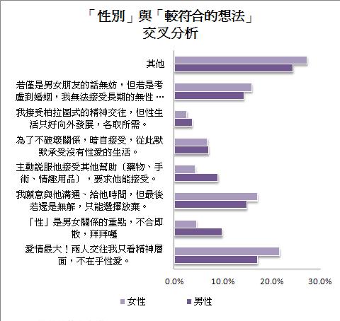遭遇性事不協調時,男女的看法會有什麼差異呢?就生理上來說,男女皆有需求,從市調結果來看,不只男性在乎性愛,女性在性事也十分重視,像在「考慮到婚姻,無法接受長期無性生活的選項的男女比例」、「願意溝通、給他時間,若無解才會放棄」,便意外的女性比例多於男性。而往往被喻為靠身體思考的動物-男性身上,在「接受精神交往、但性生活只好向外發展、各取所需」、「主動說服他接受其他像是藥物、手術、情趣用品等幫助,並要求他接受」以及「性是男女生活的重點,不合即散」則可想而知,為男性遇到性事不順時,最直接的處理方式。