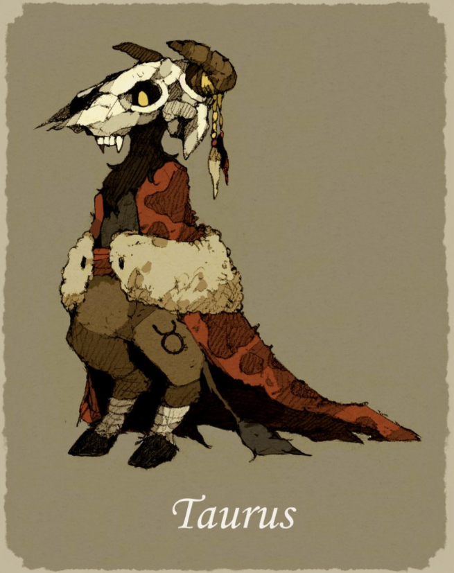 頭戴「牛的骸骨」的金牛座,彷彿是在西方奇幻故事裡登場的魔法師或大賢者OAO