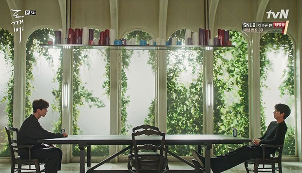 ▲黑色原木長餐桌是鬼怪與地獄使者常見的口舌刀叉對戰場,對坐超長桌的兩端,象徵二人的對立與孤獨。(翻拍自網路)