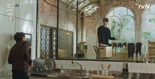 廊道休憩區長廊另端是洗衣區,玻璃隔間另邊就是室內的開放式L型料理台廚房區,側邊設計一扇外推窗,延伸洗衣區與廚房的互通。此區塊進行洗衣、晾衣、烹飪、洗滌…是鬼怪和陰間使者展現居家好男人的大平台。玻璃隔間納入室外大量光線,廚房牆面貼的是近年來流行的3D白磁磚,讓整體廚房顯得通明透亮,看來鬼怪的居家品味還與時俱進哩!