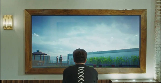 ▲ 劇組後製的傑作將窗框崁入影片權充觀看視頻的百吋超大螢幕,視聽室氣勢真是雷到極點。(翻拍自網路)