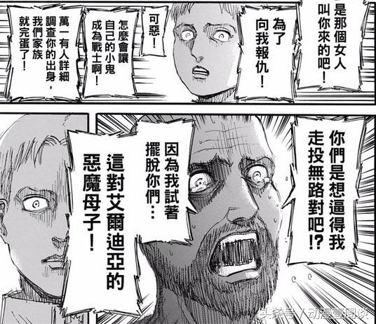 並且堅信牆內的人是惡魔,而自己是戰士,為了還清艾爾迪亞人的罪孽,自己需要消滅他們。(艾倫的翻版)