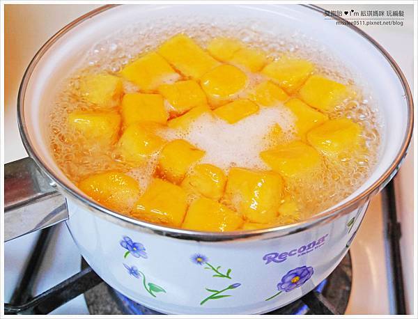 地瓜煮熟軟化後,請將地瓜全都壓成泥狀。
