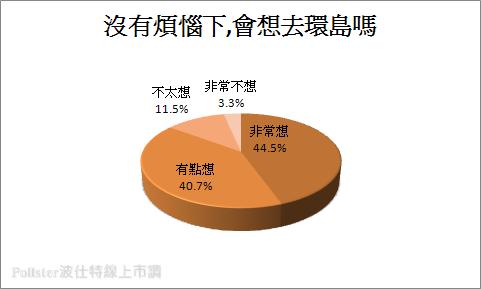 近年來人們開始注重休閒生活,環島旅行越來越常見,請問在沒有外務纏身煩惱下,會想去環島嗎? 調查結果顯示約八成五的受訪者皆表示「想」!其中依照程度不同又可以細分為44.5%的民眾表示「非常想」、40.7%的民眾表示「有點想」,相反地表示「不想」者則占不到兩成的比例;表示「不太想」占11.5%的比例、「非常不想」占3.3%的比例,可以了解整體而言,只要有閒,多數國人都想要來一趟環島旅行,走遍台灣每個角落、體驗北、中、南、東不同的面貌和風情。