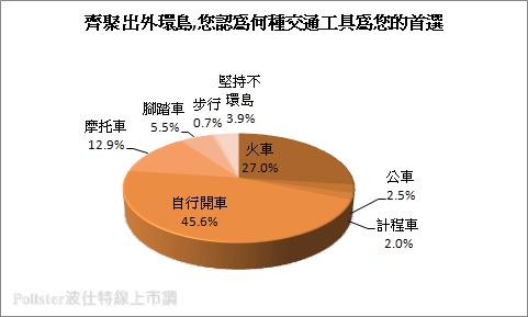環島的方式有很多,走路、腳踏車、搭車、開車……如果真能和家人朋友齊聚出外環島,您認為何種交通工具為您的首選?結果顯示多數民眾選擇「自行開車」,占45.6%,想去哪開去哪,時間不受限制,相對快速且不用耗掉太多體力,成了國人第一名的環島方式,其次占27.0%的民眾則是選擇「火車」,台灣火車線路算是完整,藉此環台是沒有問題,且要慢要快還有多種選擇,不需要自己駕駛、不需要擔心路況,沿途欣賞美景、吃吃鐵路便當,愜意的環台方式成為民眾的第二選擇。排名第三則是較易風曬雨淋、速度相對較慢,不過機動性頗高,還可以盡情吹吹風的「摩托車」環島,占12.9%的比例。其它選擇像是熱血的「腳踏車」則是占5.5%、「公車」占2.5%、「計程車」占2.0%、「步行」則僅占0.7%的比例,至於表示「堅持不環島」則是拿下3.9%的比例。