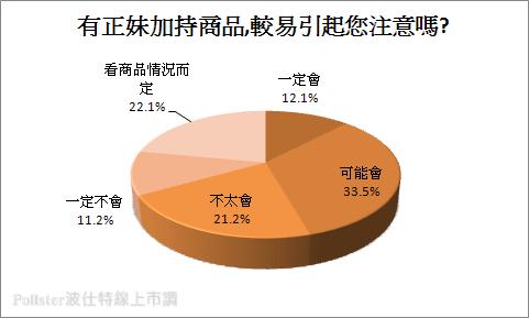 現在不管大街小巷都可以看到正妹廣告、正妹開球,彷彿牽扯到正妹就可以讓人氣爆走,那麼一般民眾認為有正妹加持的商品,真的會比較吸引注意嗎?調查結果發現,有12.1%的民眾表示「一定會」,33.5%則認為「可能會」,而有21.2%則表示「不太會」,11.2%則是「一定不會」,最後則是「看商品情況而定」佔了22.1%。由此可知,有45.6%的民眾認為正妹牌還是具有相當程度的效果和吸引力﹝一定會+可能會﹞,不過也有32.4%認為「不會」,所以其實不見得正妹牌具有非常了不起的效果。