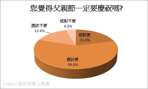 很快的八月八日又要到了,大家都開始在搶訂餐聽了,請問您覺得父親節一定要慶祝嗎?調查結果顯示,有21%的受訪者表示「絕對要」,有高達59%認為「應該要」;「應該不要」的則有15.4%,最後則是「絕對不要」則有4.5%。由此可知,有高達80%的民眾認為父親傑是要慶祝的﹝絕對要+應該要﹞,因為父親節也就是一年一次,趁此機會也可以讓所有在外奔波的家人有機會聚在一起吃個飯,同時也表達對於父親的感謝,因此父親節的時候慶祝一下是有必要的。