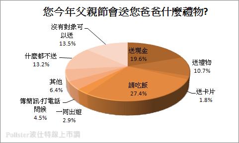 今年父親節又到了,想必各大餐廳和飯店又將出現慶祝佳節的人潮。Pollster波仕特線上市調﹝http://www.pollster.com.tw﹞在7/25就特別針對了「父親節」進行了市場調查。
