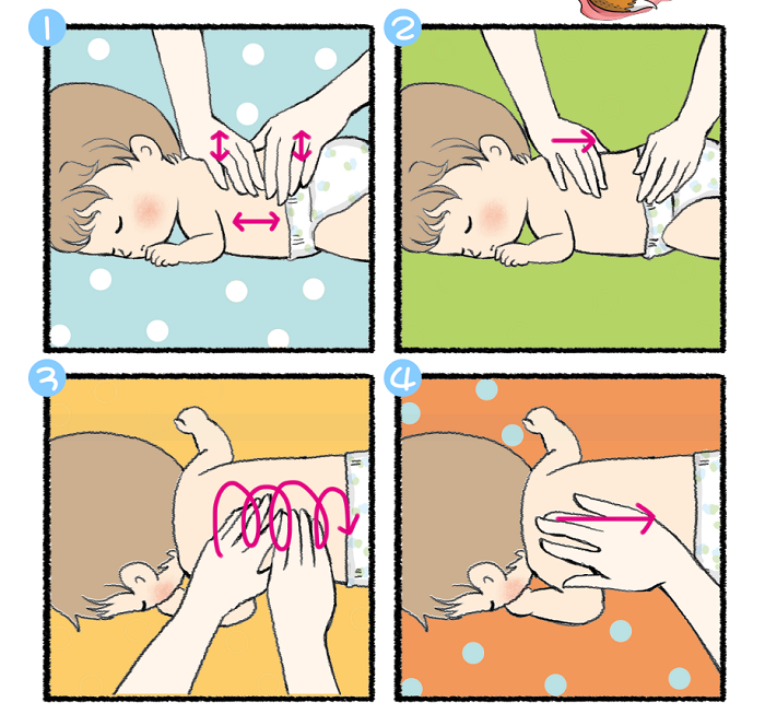 3 雙手四指併攏,以指腹在寶寶背部順時針畫圈按摩,做5 次。