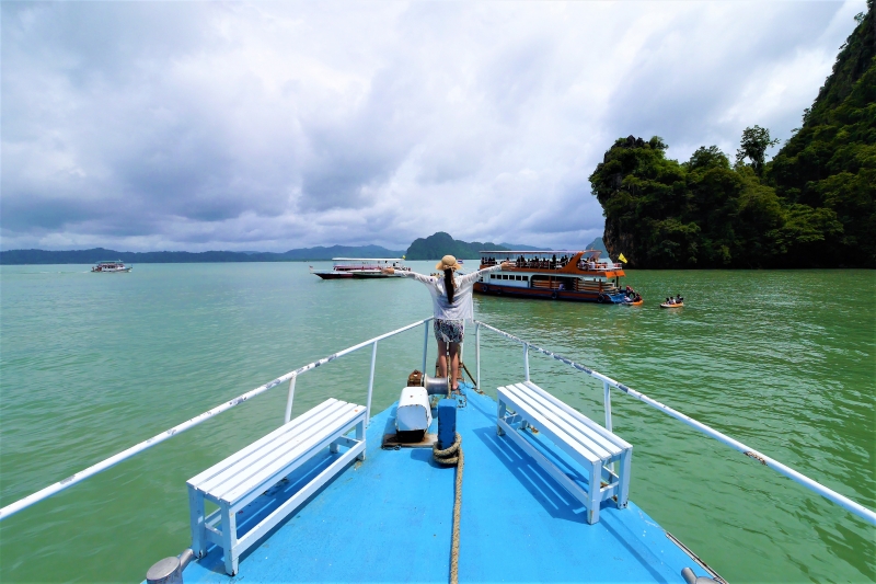 公尺的長橋氣勢磅礡,跨越潮間帶連接著海中央的碼頭,碼頭邊有長尾船、快艇、大遊船三種選擇可前往攀牙灣。前幾次遊歷攀牙灣都是由旅行團包快艇,過程中風大噪音吵,為了避開飛噴的浪花把大家罩在遮雨棚中,因此無暇、也缺乏視野可以欣賞風景。直到2016 年在旅館老闆Alvin 的推薦下參加大船一日遊行程,才真正享受到徜徉在奇岩海灣的樂趣!