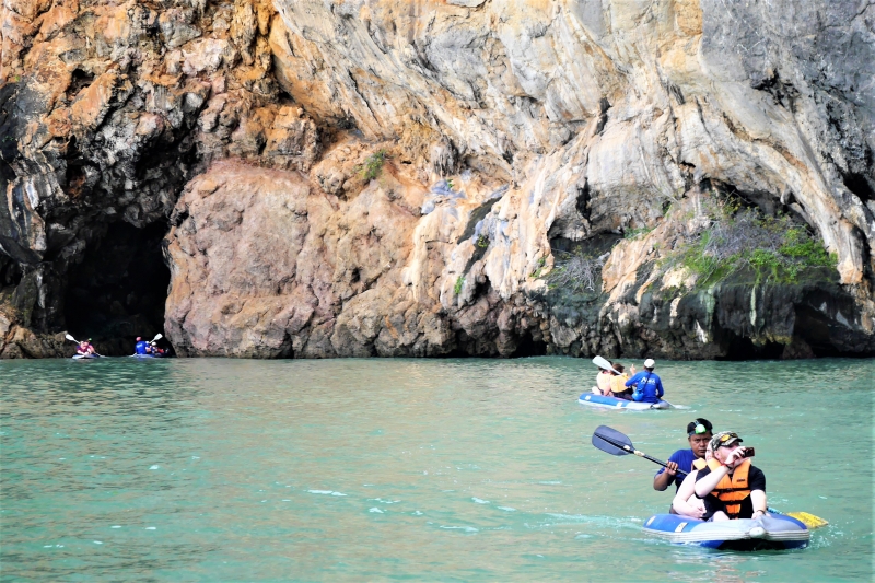 大船開到Panak Island 前停泊, 與其說這是一座島、其實更像一顆被大自然開鑿鑽洞的巨石,因為它沒有淺灘或陸地可以上島,唯一接近它的方式就是乘坐獨木舟前進探險。此時大船船尾有多艘充氣獨木舟被堆下海,戴著頭燈和船槳的船伕一一登舟準備,這才發現原來冒險所需的一切人力配備都裝滿在底層船艙,隨著我們從普吉島渡海而來。船伕泛著輕舟載我們漂遊Panak Island,好像穿梭在一個迷宮當中:滴水穿石的溶洞層層相連,交錯延伸的鐘乳石柱壯觀綺麗,船夫帶著我們從巨石夾縫下仰望一線天,又邀請我們在回音繚繞的自然天井中高聲歌唱,樹上棲停棧的犀鳥、燕子,潮間棲息的彈塗魚、招潮蟹,被大自然包圍的片刻總是萬分美妙!