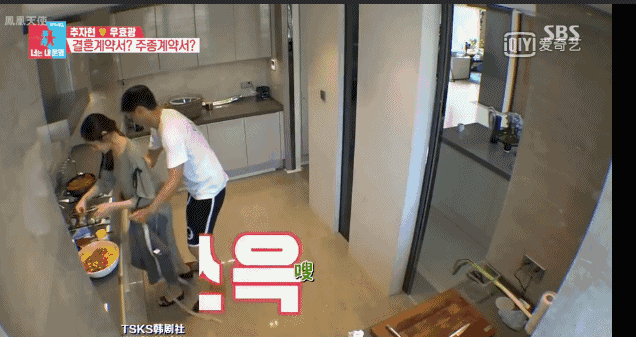 秋瓷炫在做飯,結果老公突然從背後幫她系上圍裙,親親抱抱對於兩個人來說實在是小菜一碟。