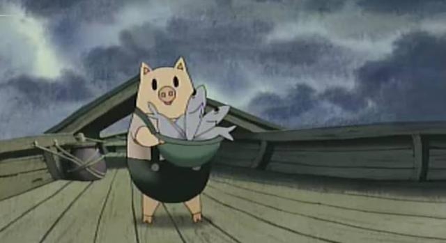 還有一段情節,貓弟弟和姐姐在海中落水,有一頭豬好心把他們救上了船,還捕魚給他們吃——
