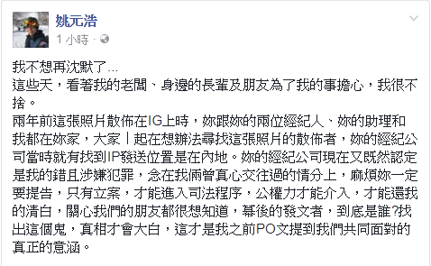 因王心凌私密照外流事件成為過街老鼠的姚元浩,沉默12天後終於又再臉書發文,但非求饒或認錯,而是硬起來鼓勵前女友提告、才能有公權力介入還姚元浩清白,此舉等於也是姚元浩再度否認散播照片。