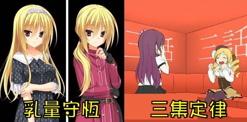 很多二次元妹子在不同場景下,都會顯示出完全不同的乳量效果(如上圖所示),有人便總結出二次元妹子的乳量是絕對守恆噠,只是因為擠壓、放鬆、運動等等巴拉巴拉的原因導致外觀有些許不同罷了。(我個人感覺只是扯蛋)