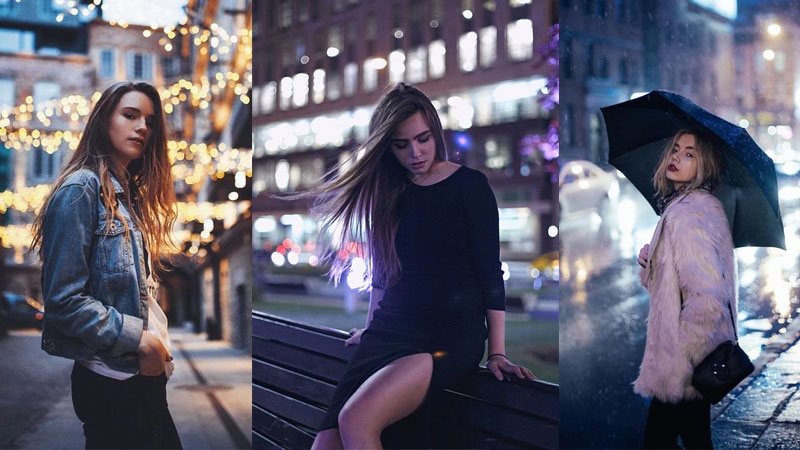 拍攝夜景通常是最難的一環,如果想要拍出好看的照片勢必就需要閃光燈,但是一般人對於閃燈都操作不是那麼流利時,可以嘗試把相機的感光度、光圈調高,以特寫的方式拍攝,利用身上與地面的光線反差,可以增加畫面的層次。擺動作時,假裝自然一點,假裝隨意一點,讓動作稍微慢一點,這樣對於沒有閃光燈的相機來說就能拍出好照片。