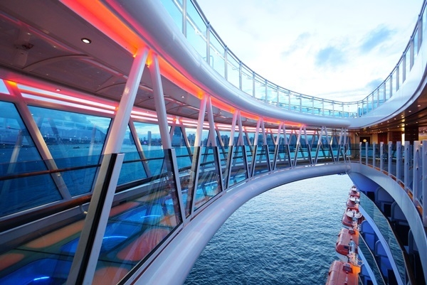 一定不能錯過的設施還有「海上天空步道」,為公主遊輪獨創的海上十大新奇特色之一。圓弧形的道設計能飽覽360度的海上全景,以透明玻璃打造長達8.5公尺步道,加上凌空39公尺,無論是走在上面或是低頭欣賞打在船身上的海浪,都在考驗膽量,心目中最值得拍照打卡的地點非海上天空步道莫屬。