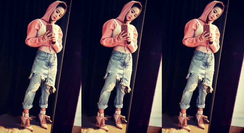 平日的Jolin即使穿著隨性,卻仍然星味十足,一條破褲搭白色綁帶襯衫就很有型