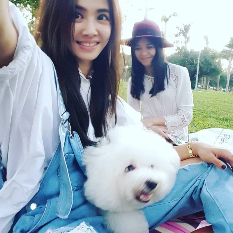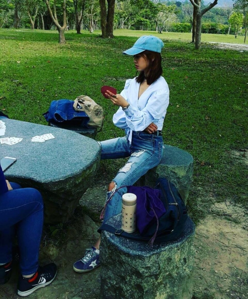 Jolin平日和朋友去公園野餐時,穿著寬鬆蝴蝶袖白上衣和牛仔吊帶褲既休閒又可愛!你看她素顏可愛的笑容,完全就是她18歲出道時的模樣啊!超級凍齡呀!