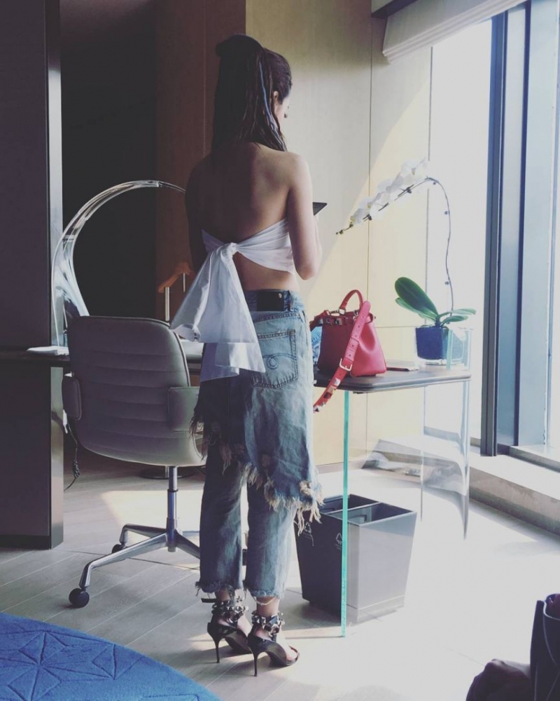 這條R13的假兩件式牛仔褲,Jolin搭上一件露背綁帶上衣和龐克搖滾風的高跟鞋,性感逼人!