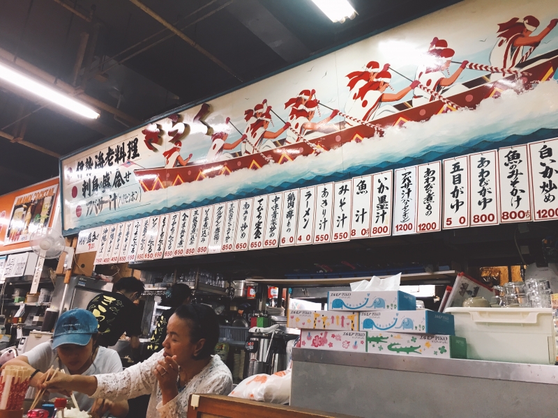 我們幸福的邊走邊逛,終於抵達了牧志市場,討論了一下就決定先上二樓餵飽我們飢餓的肚子。裡頭真的很多家店,每位店員都很熱情的招攬客人,有些店家還會提供日、中、英等語言服務,對不擅長說日文的觀光客有極大幫助。我們大家抉擇了很久,因為每間店都很吸引人,於是決定去了一家附有翻譯服務的きらく料理店。這間店十分適合國外自助旅行的遊客來嘗試看看,菜單上豐富的菜色真讓人不知如何選擇,於是我們點了許多沖繩在地料理如沖繩東坡肉、沖繩風味薄煎餅、海葡萄及生魚片等,準備開始展開大吃特吃的攻略了!一道道的美味菜色上桌,我們幸福的「第一牧志公設市場大餐遊」不知不覺在享受中結束了。