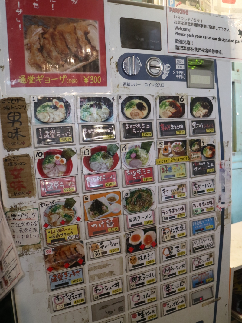 消化特別好的我和弟弟,搭電車時就已經飢腸轆轆了,於是決定到鼎鼎有名的通堂拉麵享用餐點。通堂拉麵及暖暮拉麵是沖繩的必吃拉麵,「琉球新麵 通堂」有斗大的紅色招牌寫著「通堂」兩個大字,饒富古意的建築,讓人不禁多看幾眼,仔細欣賞。當時大排長龍,媽媽趕緊先去登記名字並寫上人數;幸運的我們,只等了一會兒就輪到了。一走進店裡,吸引了我和弟弟目光的是一台票券販賣機,還特別附有餐點照片,讓可能看不懂日文的觀光客也能輕鬆點餐。點餐時,因為後面還有等待的人潮,所以我和弟弟快速點了招牌的女麵、男麵及一份煎餃,就接著被安排入座了。