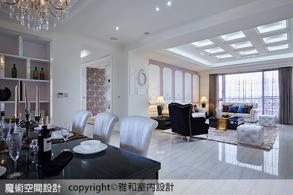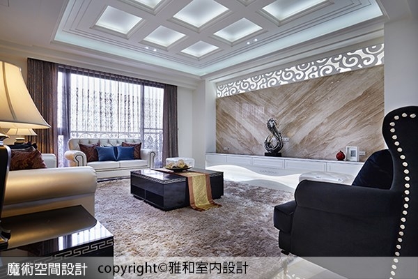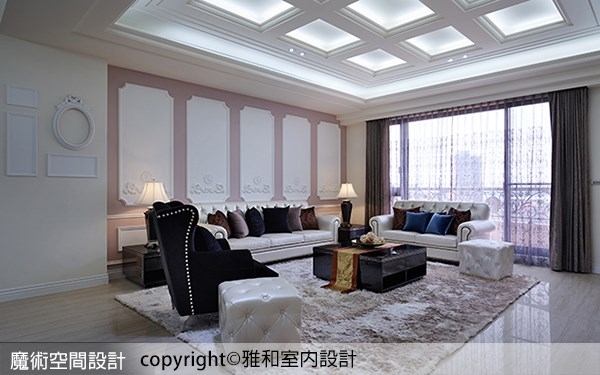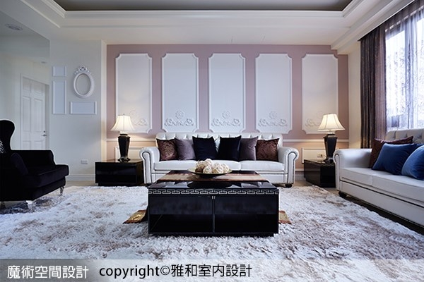 2.客廳固然貴氣優雅,但更讓人驚豔的是雅硯設計對於細節的面面俱到,沙發主牆的古典線板造型以及天花方形鏤空層板,在四周純白色彩襯托下,突顯靜謐祥和的氣息,但也適時的提醒來訪者,隱藏在溫柔表相下的,其實是優雅卻不失強悍的驚人力量。