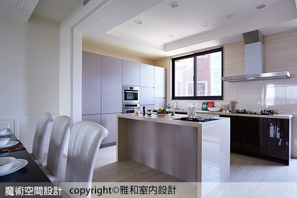 4.廚房一字型的配置不僅美觀,而且使用方便,除了設備齊全之外,雅硯設計還應屋主要求,另外加裝中島,讓廚房機能獲得進一步提升,同時中島的存在也為廚房與餐廳之間畫下一道無形界線,讓彼此的空間定位更加清晰,動線也得以加倍流暢。